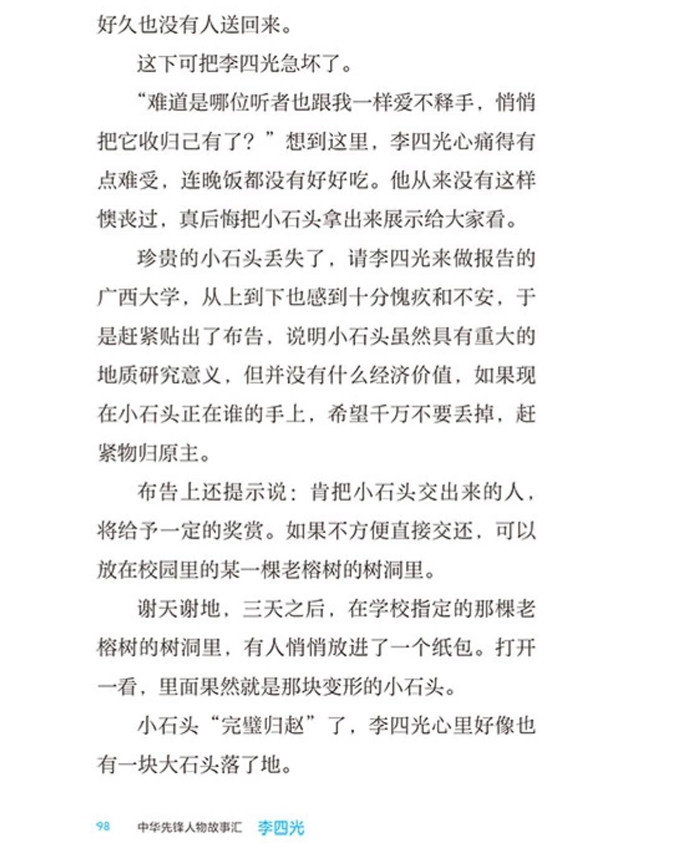 有这样一位科学家,他总爱往裤兜里装各种石头,时间久了,裤兜被磨出了破洞。于是,他便有了个绰号—“破裤子”教授。 他就是立志为祖国寻找和开发地下宝藏的中国地质科学奠基人之一,著名教育家、社会活动家李四光。 他一生钻深山,下矿井,风餐露宿,在战火之中仍然冒着生命危险坚持考察。他将力学引入地质研究,开创了一门新的学科——地质力学。在这门新学科的理论指导下,我国先后发现了大庆油田、胜利油田,找到了制造原子弹、氢弹所需要的铀矿等很多矿藏,让中国成为世界上矿产资源最丰富的国家之一。临终前,他还念念不忘要完成周恩来总理交给他的地震预测研究工作。 李四光“努力向学,蔚为国用”,把一生献给科学,献给祖国,献给人民,成为一面旗帜。