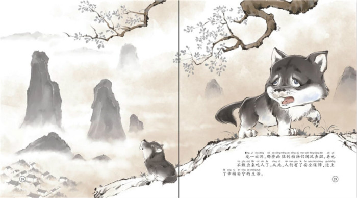 1.水墨画和版画。以《猴子捞月》为例,每一幅都美得不要不要的,猴子们的表情也都刻画得非常生动。*可以裱上画框,挂在自家墙上。浓郁的中国风使这本书区别于市面上其他绘本。