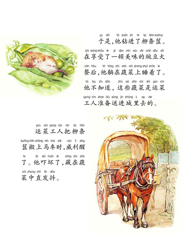 《城市鼠詹尼的故事》收录了《城市鼠詹尼的故事》《温克夫人的故事》两个小故事。《城市鼠詹尼的故事》讲述了乡下老鼠威利由于贪吃,钻进了运蔬菜的柳条筐里。柳条筐被运菜工人运到了城市里,为了逃命,乡下老鼠威利误打误撞地来到了城市老鼠詹尼的家,并和詹尼鼠一起经历了许多有趣的故事。《温克夫人的故事》讲述的是小女孩露西去山上找回自己丢失的手绢和围裙的过程中,遇到了刺猬洗衣工温克夫人,并在温克夫人家找到了丢失的东西的故事。