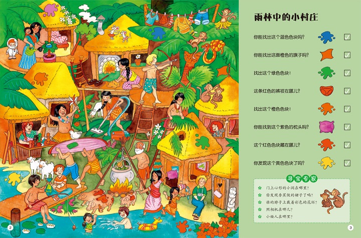 为了鼓励孩子发现线索,游戏类大画册设计了“普通任务题”和 “寻宝专家”栏目。每完成一项普通难度的任务,孩子便可勾选、标记,帮助他们培养做事情的条理性并获得成就感;“寻宝专家”通过问题提示,引导孩子通过观察、分析来寻找答案,具有鲜明的益智游戏特征,在潜移默化中培养他们的逻辑思维能力、观察力和专注力。