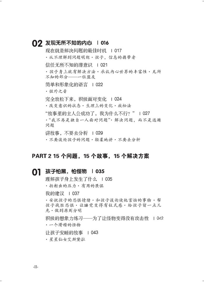 15个隐喻故事解决15个*常见的问题。怕黑怕怪物、不自信、尿床、有睡眠问题、当父母分开了、软弱、焦虑、爱生气、什么都想做好、嫉妒、爱撒谎、被人嘲笑、需要面对死亡、有分离焦虑、爱赌气。故事承载着强烈的信号,帮助孩子历经考验,战胜困难。故事告诉孩子:既然故事中的主人公在历经磨难之后成功摆脱了困境,你也一定能做到!在潜移默化中,孩子增强了信心,增强了积极掌控未来生活的能力。