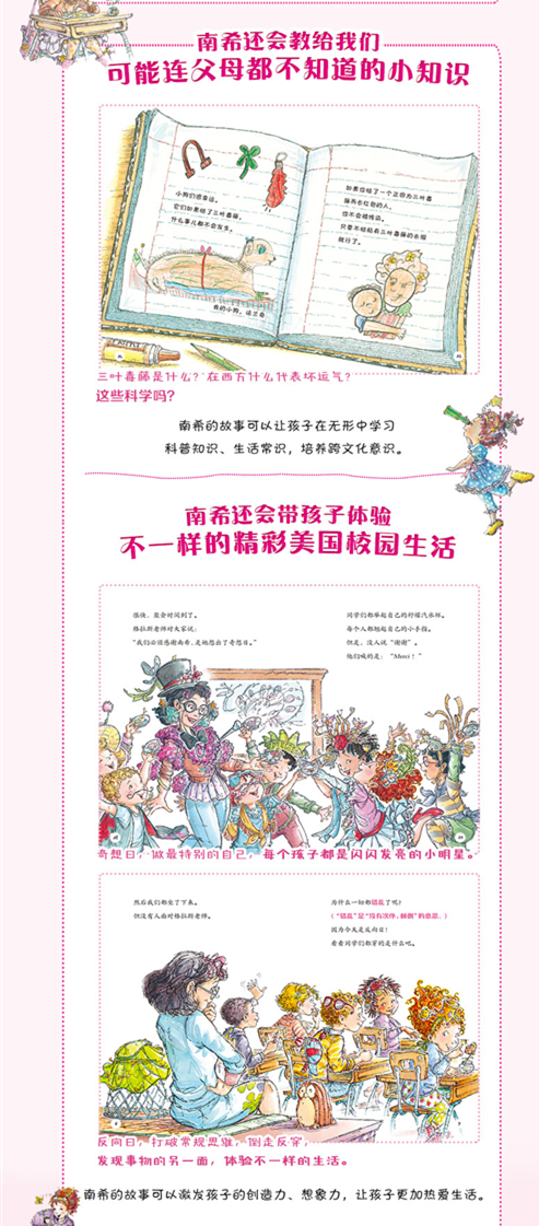 本套书包括《星空展》《每天都是世界地球日》《精彩的读书报告》等30个充满奇思妙想的有趣故事。并且,这些故事富有教育意义,能让孩子能从中学到很多生活的道理和知识。这套图画故事书不仅可以让孩子学习南希的时尚、自由和个性,也可以让父母从中学习如何更好地与孩子相处,引导孩子走向更好的人生。