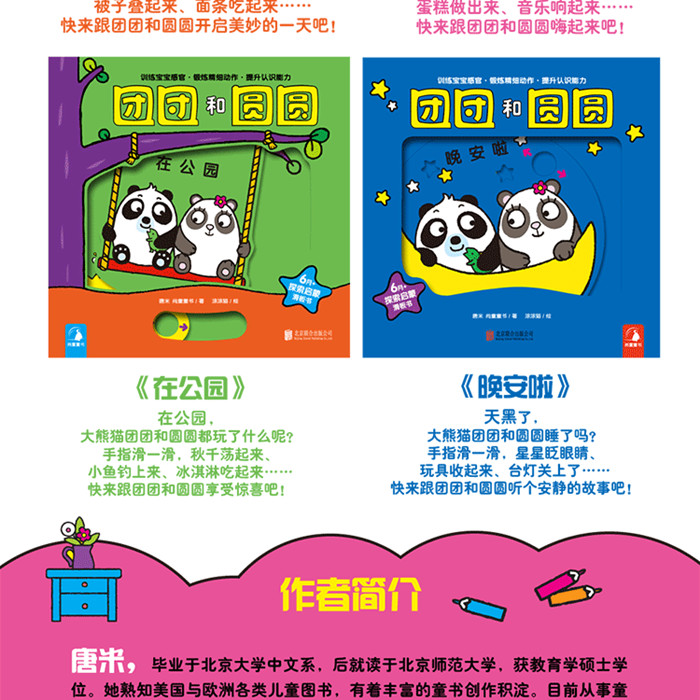 “团团和圆圆”系列可以说是一套质量上乘的原创低幼玩具绘本。硬纸卡以及贴心的圆角设计,可以说是低幼绘本的标配。更加难得的是这套书不仅从形象、色彩、细节到机关的设计均是兼顾特色与创意,在情节设计上更是尽量贴合宝宝的生活,将宝宝最为熟悉的“起床、在家里、在公园、晚安”四个场景做为书的主体内容,借由书中的“团团和圆圆”两个角色将小宝宝们的日常生活活灵活现地展示在了我们的眼前。同时,这套书也将宝宝的阅读与生活紧密地关联了起来,让阅读更好地与宝宝的生活进行结合。宝宝不仅可以在阅读时将生活中的场景重演,同样也可以将书中的场景在生活中重现。而这对于宝宝日常认知和生活经验、常识的习得有着巨大的帮助。