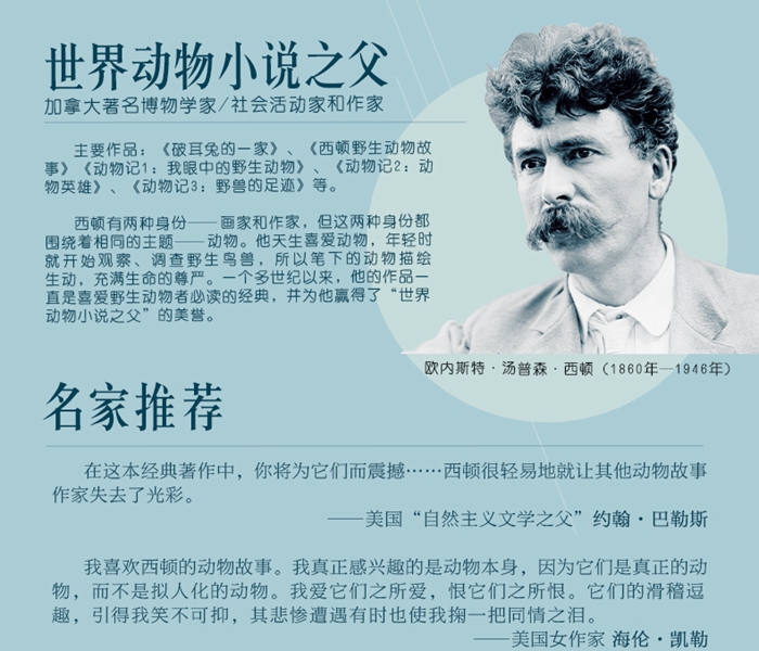 西顿有两种身份——画家和作家,但这两种身份都围绕着相同的主题——动物。他天生喜爱动物,年轻时就开始观察、调查野生鸟兽,所以笔下的动物描绘生动,充满生命的尊严。一个多世纪以来,他的作品一直是喜爱野生动物者必读的经典。
