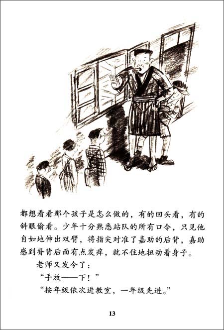 可那少年一会儿眨眼环视教室,一会儿又回头望望这边的孩子们,仍然双手端放在膝盖上,坐在椅子上。