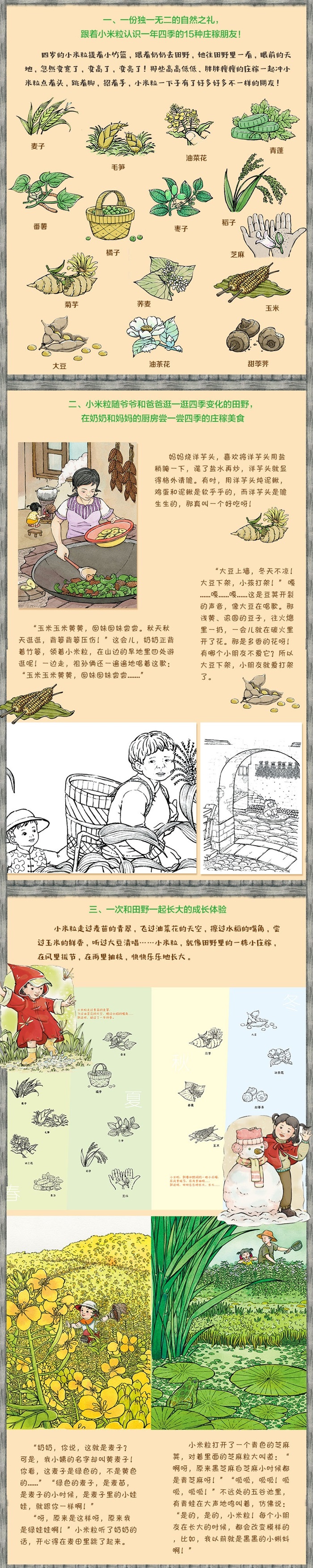 ?中国原创精品、金波幼儿文学奖入围作品、多届冰心儿童图书奖得主毛芦芦*力作,文字灵动多姿,奔涌着情感和生命。 ?作者独特地将植物的拔节与孩子的生长结合在一起,给人以全新的角度去认识孩子的成长和植物的成长。 ?青年插画家杨佩琪插图,既展现了乡村世界的生命力,也细腻描摹了小女孩世界的新奇、美好。 ?大开本全彩拼音,帮助孩子进入自主阅读。 ?这是一份有滋味的自然之礼,一趟边逛边尝的四季田野之旅,一次和田野一起长大的成长体验。跟随四岁的小米粒,逛一逛四季庄稼变化的田野,尝一尝四季的庄稼美食。不仅可以“吃”春天,还可以“吃”夏天,“吃”秋天,“吃”冬天,“吃”下更多大自然的美好!