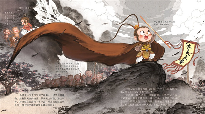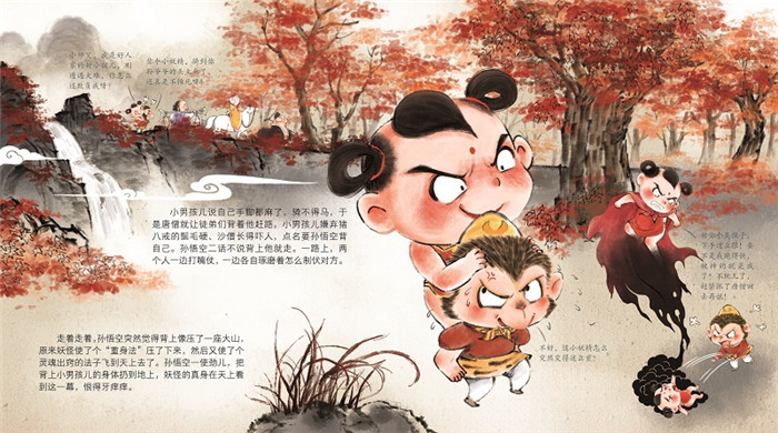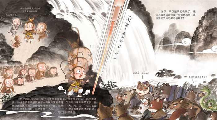 传世经典,水墨萌绘,匠心绘制西游魔幻世界,给孩子更美的童年记忆 ?中国孩子的超级英雄故事 ?古典文学名著绘本版 ?《西游记》是小学语文书目 ?憨萌逗趣,刻画传神 这是一套转为小朋友绘制的西游取经故事集,每个角色均采用“三头身”的萌趣设定,符合当代儿童的喜好,每一个细节、动作、神态都刻画到极致,让孩子一读再读,爱不释手。 ?口语文字,通俗易懂 在尊重原著的基础上,这套《西游记》绘本的语言文字极尽口语化,通俗风趣,适合父母和孩子一起阅读。 ?水墨皴法,大气写意 这套绘本的场景主要用水墨画皴法,画时先勾出轮廓,再用淡干墨侧笔而画,表现山石、峰峦和树身表皮的脉络纹理, 呈现出大气写意的视觉美感。 ?电影分镜,冲击力强 每一页采用电影分镜式设计,在整体感极强的画面里隐含着分镜头顺序,画面丰富而切换有序,小朋友读起来仿佛在看电影,符合他们今天的观看习惯。 ?贴近原著,深入浅出 这套书的每一个细节都尽可能贴近原著描述的场景和人物,并在此基础上剔除了较复杂难懂的情节,适合做儿童的*套《西游记》启蒙。 ?随书附赠超值音频,资深少儿节目主持人倾情演绎,适合无限次循环收听