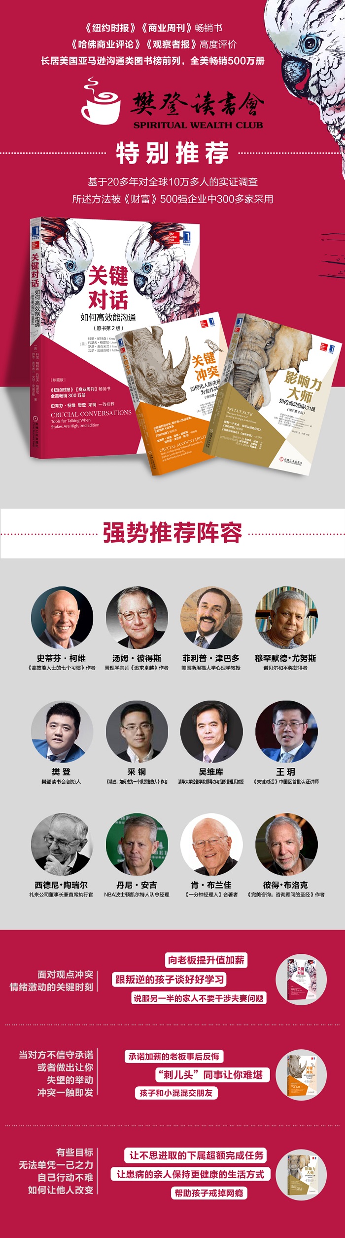 关键对话的逻辑、方法、步骤已经完全融入了我和大量读书会书友们的血液,成为我们处理问题的标准步骤。掌握关键对话,不但可以达成目的,还能增进关系!