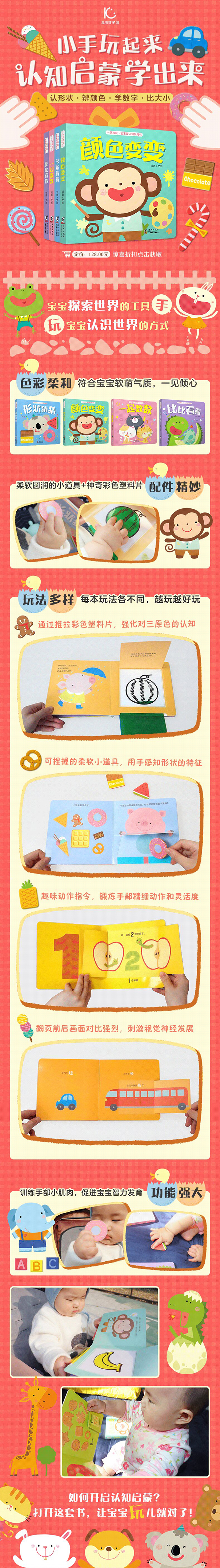 禹田文化“一玩再玩”系列玩具书*原创作品。该系列涵盖4大基础认知领域:颜色、形状、数字、比一比。让宝宝通过封面上可抠取的小物、彩色塑料片等道具,在抠、翻、推、拉等一系列动作中,用小手探索世界,用小手开启认知启蒙。宝宝手指更灵活,头脑更聪明!