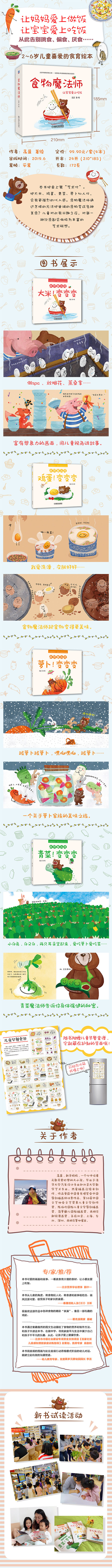 本书把桌上餐“艺术化”。把大米、鸡蛋、青菜、萝卜拟人化,会有更强烈的代入感。食物魔法师通过怎样的方法把单调的食物变成各种美食?儿童对此有兴趣之后,对每一种饮食都会做极为丰富的艺术联想。