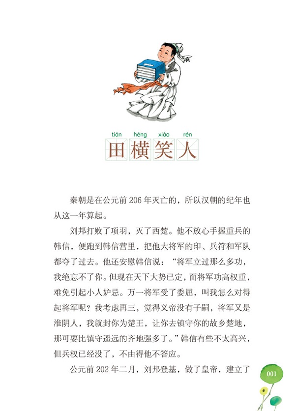 田横笑人 秦朝是从公元前206年灭亡的,所以汉朝的纪年也从这一年算起。 刘邦打败了项羽,灭了西楚。他不放心手握重兵的韩信,便跑到韩信营里,把他大将军的印、兵符和军队都夺了过去。他还安慰韩信说:“将军立过那么多功,我绝忘不了你。但现在天下大势已定,而将军功高权重,难免引起小人妒忌。万一将军受了委屈,叫我怎么对得起将军呢?我考虑再三,觉得义帝没有子嗣,将军又是淮阴人,我就封你为楚王,让你去镇守你的故乡楚地,那可要比镇守遥远的齐地强多了。”韩信有些不太高兴,但兵权已经没了,不由得他不答应。 公元前202年二月,刘邦登基,做了皇帝,建立了汉朝。后人称他为汉高祖,他立吕雉为皇后,公子盈为皇太子,定都洛阳。 天下平定后,汉高祖还有一件心事:齐王田广死后,他的叔叔田横做了齐王。齐王田横带着五百多人逃到了一个海岛上去避难,他们在海岛上种起了庄稼,就这么靠着种地和捕鱼过着艰苦的生活。 汉高祖因为田横很得人心,怕他们以后趁机再作乱,所以一听说他躲在海岛上,就派使者到海岛上去传达命令,说要赦他们的罪,叫他们回来。田横招待了使者,请他先休息一下。他立刻召集了手下的五百多人,商议投降的事情。五百人都说:“不能投降!刘邦表面宽大,内心狭窄,是个刻薄小人,大王绝不能去。”田横就回绝了使者,对他说:“我烹了郦食其(lì yì jī),已经得罪了汉王,再说郦食其的兄弟郦商正在汉王左右,他绝不能放过我。请替我拜谢汉王,让我做个老百姓吧。” 使者回报了汉高祖,汉高祖把郦商叫来,对他说:“要是齐王田横到来,有人敢动他一根汗毛,或者敢得罪他的随从人员的,一律灭门!”郦商吓得缩着脖子,连连说:“是,是!”汉高祖又派使者带着使节、诏书去招收田横。 使者第二次到了海岛上,对田横说:“皇上说了,只要你们去,大则封王,小则封侯;倘若不去,他只好发兵来剿灭你们了。” 田横再一次跟海岛上的五百多人商议。他们说:“大王不能去。封王、封侯,说得多好听!他高兴了,可以封你为王,封你为侯;一不高兴,也可以打你的耳光,砍你的脑袋!人家变了脸,再想回来可就办不到了。咱们不如在海岛四周多设营寨,加紧防备,就算有千军万马也没法过来。” 田横说:“使不得!我对诸君没有一点儿恩德。这些年,你们跟着我没少吃苦,我却没让你们享过富贵。要是我不去,汉王必定发兵来攻,诸君必然会被我连累。这么多人为我一个人死,说什么我也不干,我还是去吧。”他们嚷着说:“我们愿意跟大王共生死,要去一起去,死也死在一块儿。”田横摆摆手,说:“要是大家都去,人数过多,容易引起误会。我一个人去,汉王不会生疑。我去了以后,如果还不错,我再派人来接你们。”他就带了两个门客,跟着使者去了洛阳。 到了距离洛阳只有三十里地的驿舍,他们先歇了歇。田横对使者说:“做臣下的朝见皇上,应当洗个澡、换身衣服,表示敬意。我就在驿舍里洗个澡,行不行?”使者答应了。 田横支开了使者,对两个门客说:“我是齐国的臣下,应当忠于齐王。齐王被敌人杀了,我去投奔敌人,今后哪还有脸再见人?要是后人都学我,见谁强去奉承谁,那天下还有忠义吗?我和汉王原本都是王,现在他做了皇帝,我去当俘虏,处处看他的眼色,听他的使唤,多羞耻呀!再说我杀了郦商的哥哥,现在去跟他的兄弟一块儿伺候一个主人,尽管他由于害怕汉王不敢为难我,可我自己心里也觉得惭愧。” 两个门客愁眉不展地听着,还没来得及说话,田横已经自杀了。两个门客抱着尸首,哭了一会儿,一咬牙,不再流泪了。使者听到了哭声,进来一看人已经死了,只好无可奈何地包了田横的脑袋,叫两个门客捧着去见汉高祖。 汉高祖见了田横的人头,不由得叹息着说:“唉,他们哥儿三个(指田荣、田广和田横)平民出身,先后都打天下,做了齐王。真了不起!”他就拜田横的两位门客为都尉,派两千名士兵造了一座坟,用安葬国王的礼节把田横安葬了。 那两个门客祭过了田横,就在坟边挖了两个坑,拔剑自杀了。当时就有人去报告汉高祖,汉高祖听了,挺纳闷儿。他吩咐手下把那两具尸首葬在了田横的坟边。 汉高祖对大臣们说:“你们看,田横不愿意封王,自杀了,他的两个门客也自杀了。他们怎么能有这么深的情义?真了不起!听说这么了不起的人在海岛上还有五百个。这么了不起的人,谁都钦佩,我怎么能让他们流落在海岛上呢?”他就第三次派使者去了海岛,又嘱咐使者千万要劝他们回来。 使者到了海岛上,传达了汉高祖的命令,接着说:“皇上早已说过,田横来,大则封王,小则封侯。田横已经受封为齐王,两位门客也做了大官。齐王说了,请你们快去,同享富贵。”他们着急地问:“我们的大王怎么样了?有他的信件没有?”使者说:“齐王正忙着哪,叫我捎个口信来不是一样吗?” 他们心里有些怀疑,可是田横不回来,他们也不能在海岛上住下去。去就去吧,五百个齐人,只带着随身的宝剑,跟着使者到洛阳去见齐王。他们还没到洛阳,就听到了人们纷纷议论着田横和两个门客自杀的事儿。几个领头的对使者说:“请让我们先去拜过齐王的坟墓,尽了我们做臣下的对旧主的情义,然后再去朝见皇上。”使者见这五百个壮士个个带着宝剑,沿路已经有几分害怕,哪里还敢说个“不”字。 五百个壮士到了田横坟上,祭祀了一番。悲伤到了极点,反倒没有眼泪了,他们作了一首歌,大伙儿拿挺低沉的