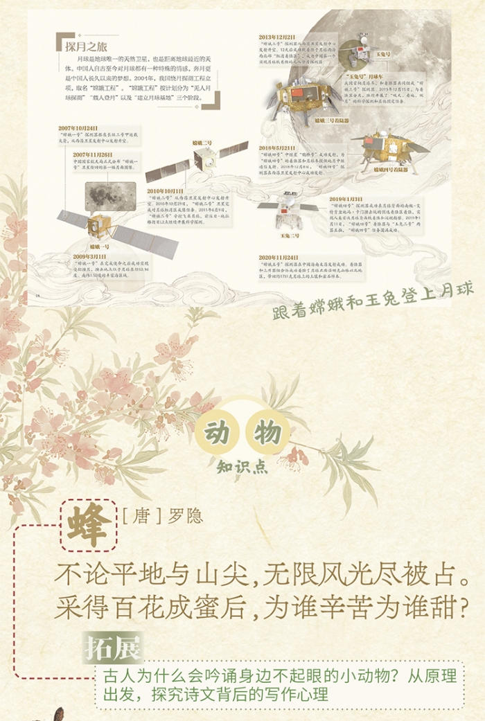 《地图上的古诗词》包含小学阶段背诵诗词75首,额外增加9首拓展诗词,古诗文原文、注释、对标教材,增加译文、诗人介绍等辅助孩子理解诗词,并在此基础上对诗文再进行深度解读。解读内容涵盖地理、历史、人文、科学科技、动植物学等多方面,打破学科壁垒,让孩子在学习诗文的基础上,可以获得更多的知识、开拓视野。并且,大量使用古画插画等,营造每首诗文独特的氛围,使单纯的背诵变得更加有趣味性、知识性。解读的内容也以图画为主,文字为辅,更适合低年龄层孩子阅读、提前学习等需要。