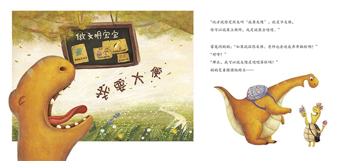 雷龙第一天上学,妈妈提醒他:“说话要文雅哦。”所以,雷龙很“文雅”地告诉小朋友,自己会做“嗯嗯蛋糕”。小朋友们都羡慕死了……经过小小的误会和真诚的沟通,最后,大家终于知道雷龙说的嗯嗯蛋糕是什么了!所有的动物一字排开,各做了一个嗯嗯蛋糕……