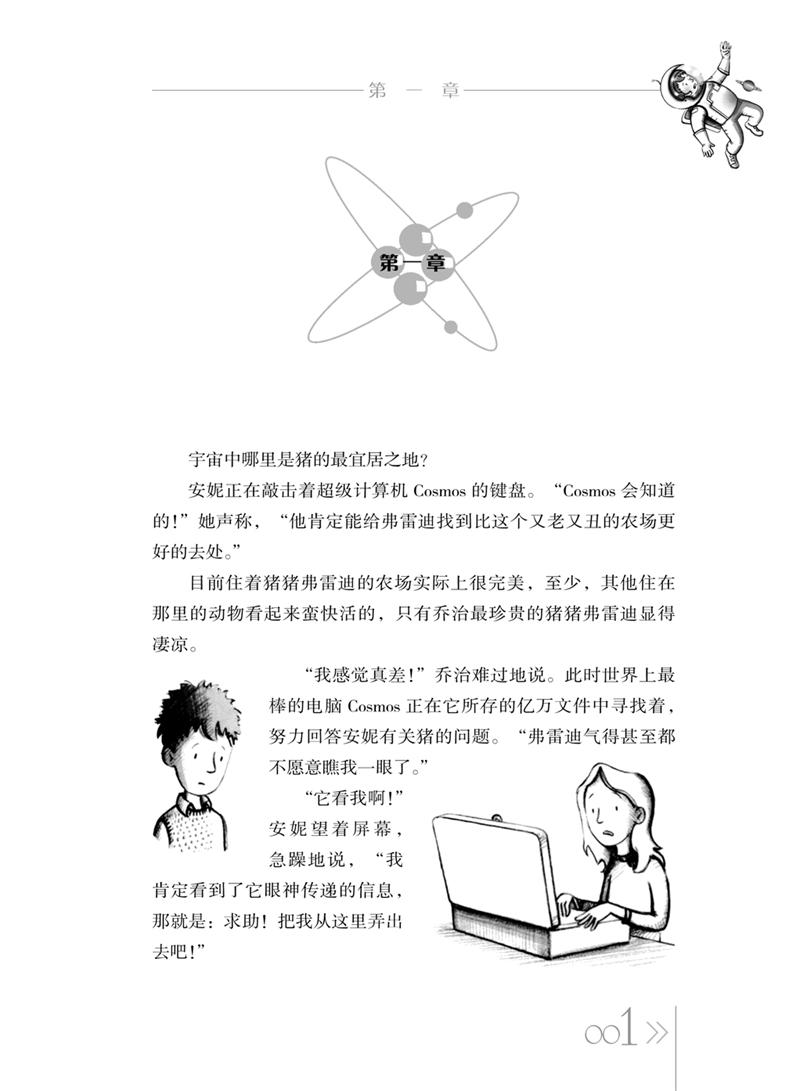因为要到邻居家找回自己的猪,乔治很偶然地遇到宇宙学家埃里克。乔治和埃里克的女儿安妮,在超级电脑cosmos的协助下,得以畅游太空。他们曾经一起搭乘彗星造访木星、土星……并在小行星暴中遇险。在见过宇宙奇观之后,乔治意识到自己过去只在后院和猪混日子是多么的乏味。此处作者引证了著名的爱尔兰作家奥斯卡·王尔德的话:“我们都在深沟中,但其中的一些人却在仰望星空。”我想,这句话虽然是为个人写的,但也适用于一个民族。