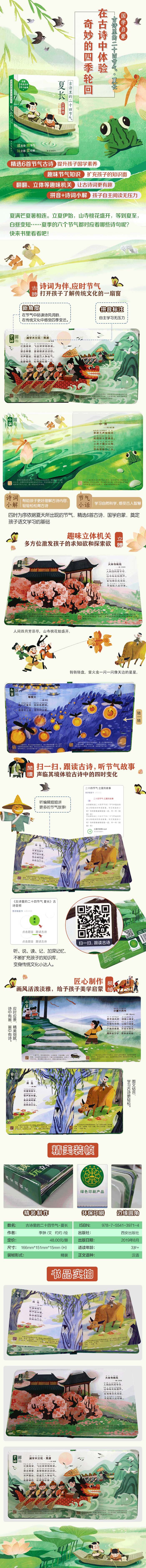 《春生》主要介绍立春、雨水、惊蛰、春分、清明、谷雨这6个春天的节气;《夏长》主要介绍立夏、小满、芒种、夏至、小暑、大暑这6个夏天的节气;《秋收》主要介绍立秋、处暑、白露、秋分、寒露、霜降这6个秋天的节气;《冬藏》主要介绍立冬、小雪、大雪、冬至、小寒、大寒这6个冬天的节气。每个节气选取一首古诗,并对其进行详细注解,“节气小话”简明扼要的说明了每个节气的特点,从古诗、诗词小解、节气小话三个部分入手,让小朋友充分了解这个节气。在此基础上,每首古诗配有精致唯美的插画和精彩生动的互动立体,从而激发孩子对东方文化的兴趣,达到启蒙的目的。