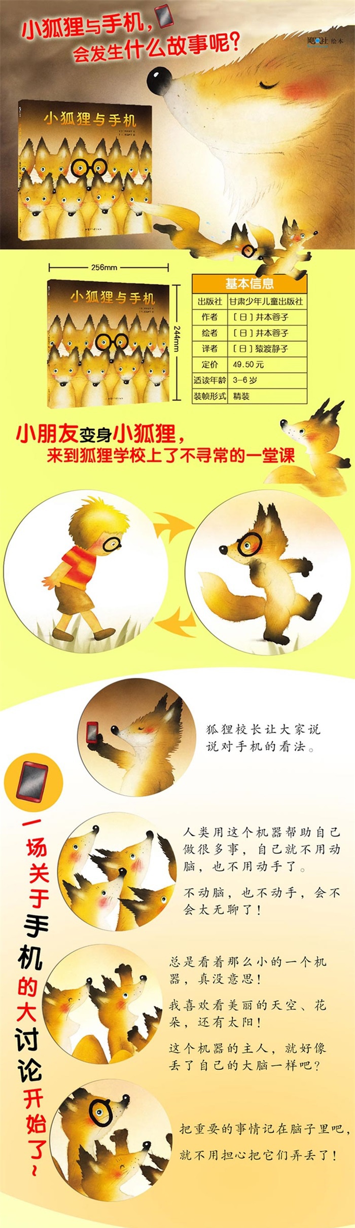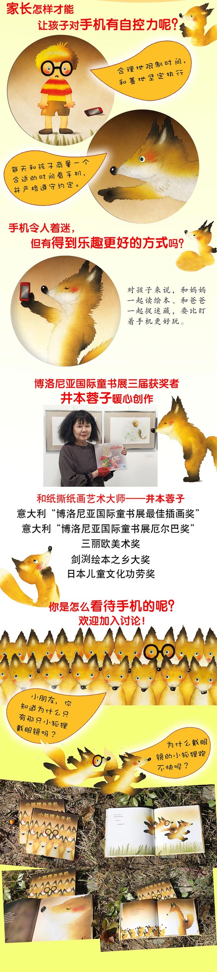 “我”的手机丢了,却意外来到了狐狸学校。课堂上,狐狸老师拿出一个小小的、长方形的东西给大家看。究竟是什么呢?“我“不禁“啊”地惊叫出来。“这不是人类手里经常拿着的那个东西吗?”“手指还在上面飞快地点啊点!”“他们在做什么呢?”……小狐狸们你一言我一语地发表看法。一场关于手机的讨论开始了!你是如何看待手机的呢?翻开井本蓉子专为孩子创作的毛绒绒、萌萌哒的小狐狸绘本,参与讨论吧!