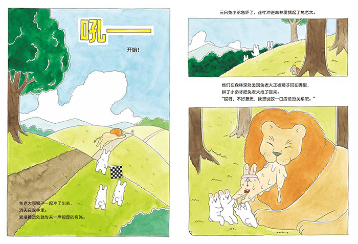 第一次看到《兔老大》,便笑了一整个下午。此后,每次翻开它,都能找到新的小小笑点——它像是一大瓶不断冒出气泡的汽水,回回拧开瓶盖,喝一口,令人快乐的小气泡就冲进了嗓子眼,变成了笑声!