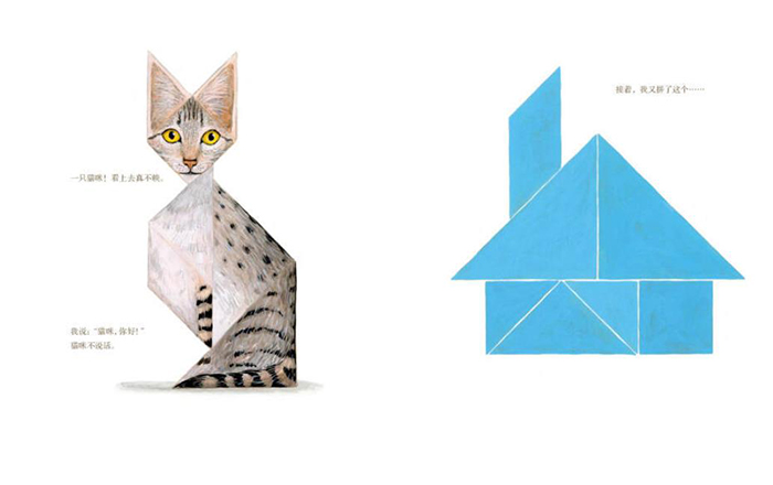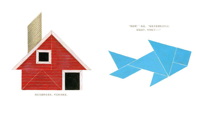 在画面表现上,不管是猫、鱼、狗还是鳄鱼等动物,都描绘得非常细腻而且写实,鱼的鳞片上的光泽、猫鼻头上的绒毛都清晰可见。这种写实感和七巧板本身的抽象性之间,形成了有趣的对照。另一方面,哪怕是再细腻、再写实的动物形象,在画面中都能清晰地分辨出七巧板拼搭的痕迹。可以想见,作者有意识地在整本书中运用白色为底色,并在描绘动物、人物时,刻意保留七块拼板的轮廓线,让孩子清晰地看到这些几何图形是如何分割与合成的,从而为孩子画出了具象世界与抽象世界之间,那一条若隐若现的分界线。
