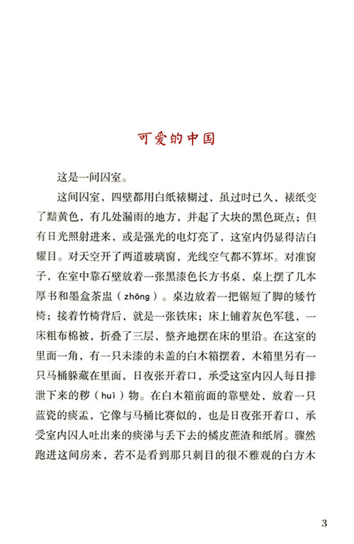 《可爱的中国》是方志敏烈士的遗著。本书收录了方志敏1935年在狱中所写的《可爱的中国》《死!》《清贫》《狱中纪实》《给党中央的信》等文稿。作者顶住“精神上的愁闷与肉体上的苦痛”,在狱中完成遗作,每一篇都朴实动人、铿锵有力。小读者在被真实恳切的内容深深打动时,自然更加理解烈士的艰辛、旧时代的苦痛和今日中国兴盛的来之不易,也会为方志敏烈士强大的人格魅力和乐观精神所折服。这些文章实事求是地概括了中国从五四运动到第二次国内革命战争以来的悲惨历史,控诉了帝国主义肆意欺侮中国人民以及国民党卖国求荣、残害同胞的种种罪行,表现出共产党人的大无畏气概和革命乐观主义精神。