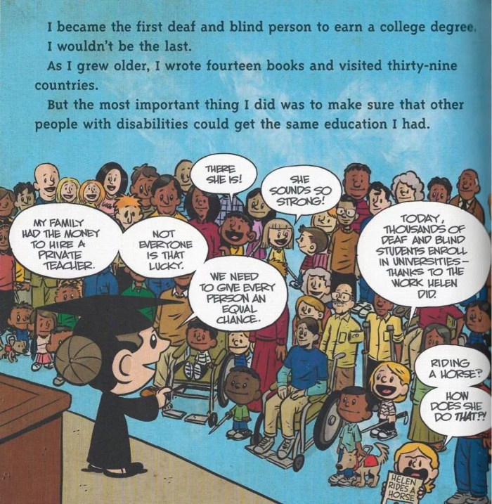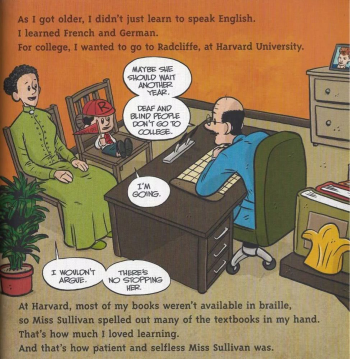 海伦·凯勒很小的时候得了一种罕见的疾病,使她又聋又瞎。当她六岁时,在莎莉文老师的帮助下,海伦学会了手语和布莱叶盲文。有了表达自己的能力,海伦长大后成为了一名社会活动家,为残疾人和其他事业而努力。