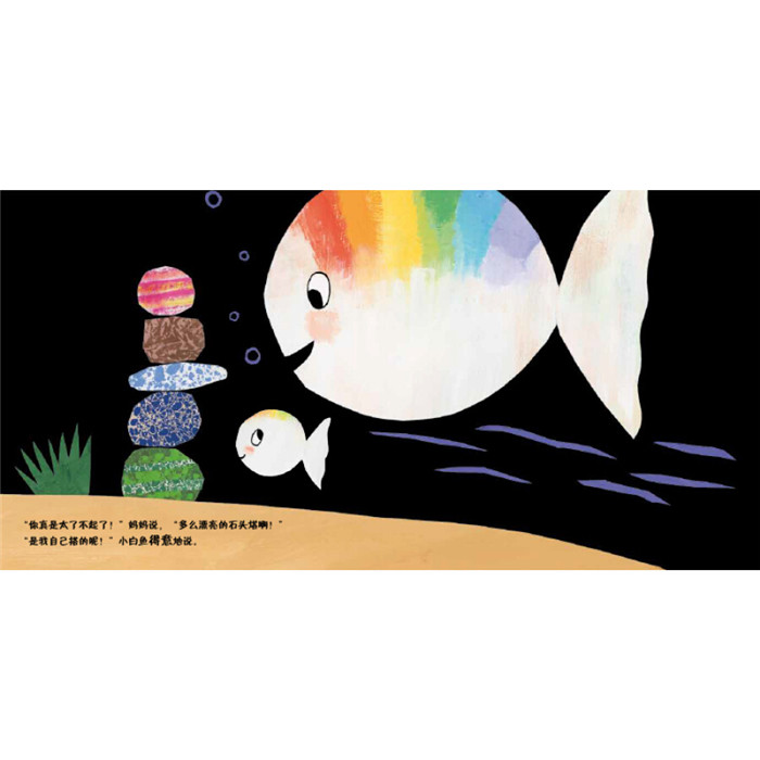 小白鱼的石头塔被大章鱼撞倒了。小白鱼好伤心。幸运的是,小海马和大海龟都来鼓励他、帮助他……