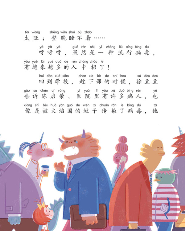 课间休息的时候,徐豆豆的同桌陈启荣神秘兮兮地告诉她,他的妈妈变成了一只大怪兽。“大怪兽?这怎么可能?!”徐豆豆才不信。她狐疑地看了一眼陈启荣。陈启荣长着一张肉嘟嘟的圆脸,学校里的女老师都喜欢捏他的脸,就连升旗仪式上那么严肃的周校长在走廊里看见陈启荣,也会笑眯眯地摸摸他的脸蛋,夸他可爱。很可爱的陈启荣常常会说一些让人忍俊不禁的话。吃午饭的时候,只要有咖喱鱼蛋,他就两眼发光:“咖喱,咖喱,我的最爱!Yummy!Yummy!”他在作家给全校同学做讲座时把手举得高高的,大声说:“姐姐,我很喜欢你!你喜欢我吗?如果你也喜欢我,那就亲我一下吧!”自然科学课上,老师拿着地球仪问大家:“同学们,你们愿不愿意猜猜看,全世界最浪漫的地方是哪里?”有人说是巴黎,有人说是夏威夷,有人说海南岛,有人说马尔代夫。陈启荣眼珠子骨碌碌转了一圈,面带笑容地说:“我觉得是梦里。”“为什么呢?”大家都很好奇。“因为在梦里可以吃到各种好吃的。”说完他还咂吧了一下嘴。
