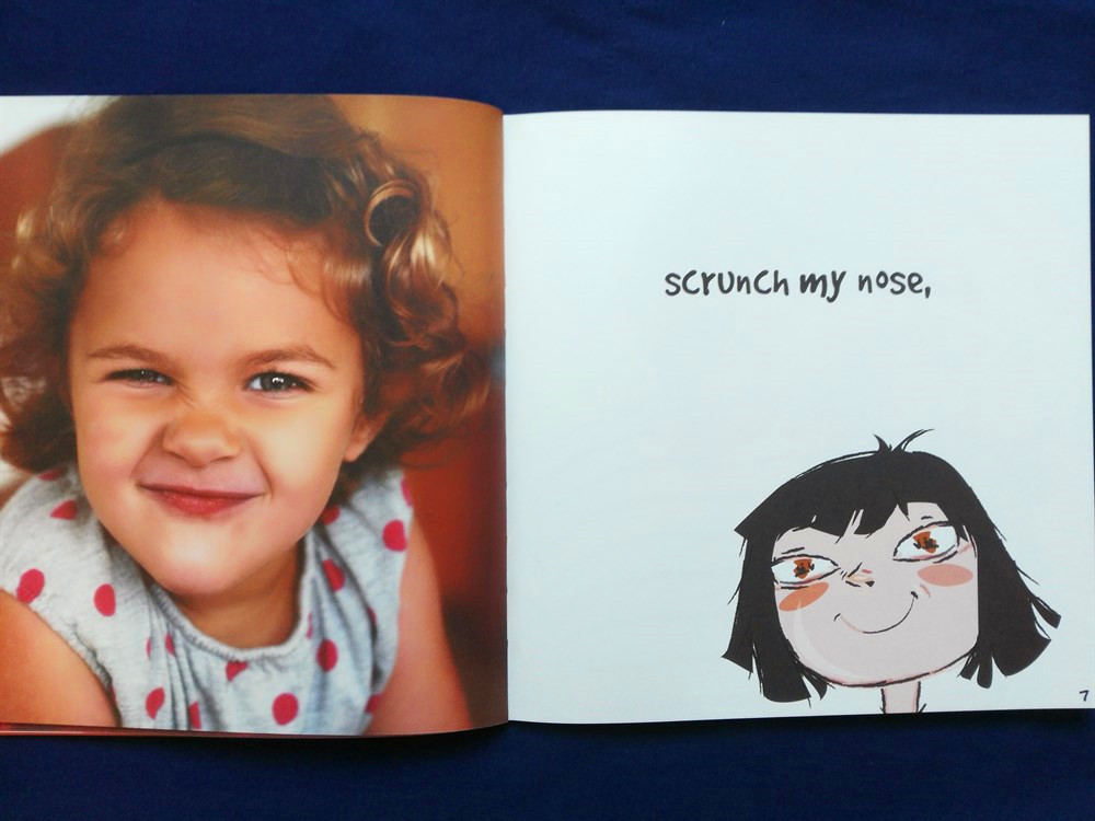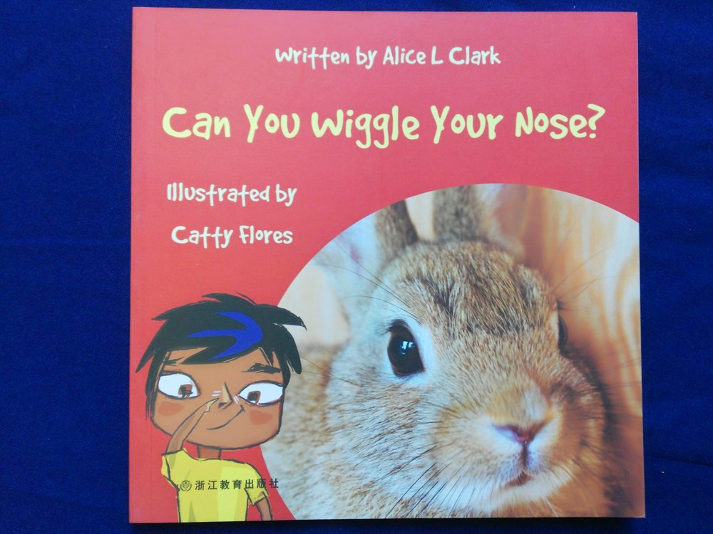你能对你的身体做什么?我能笑,能眨眼,能蹙鼻子,耸眉,鼓腮,瞪眼,能张大鼻孔,能让整个面脸变形,卷舌,扭鼻子,嘴里还发出有趣的声音。你能?排版上趣味编排。一边是做动作的真人图片,一边绘画的是做出同样动作的卡通小孩。脸上五官都用什么英文单词,动作用什么单词,可以趁机学到。小孩是特别喜欢做鬼脸,扭鼻子咂舌头嘟嘴等等的小动作,这是他们认知的一部分,也是他们喜欢的身体游戏。所以这本英文小册很符合小孩的趣味。