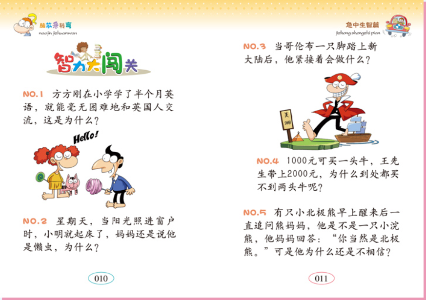 《小小口袋书:脑筋急转弯(套装共4册)》精选了一千多条积极、正向、有品位、有内涵的经典脑筋急转弯题目。其中,有的比较简单,只需要采用逆向思维的方法,便可迎刃而解;有的则较难,需要具备较强的逻辑推理能力;有的很有趣,让你从中领略幽默的智慧与知识的奥妙;有的看上去扑朔迷离,需要旁敲侧击,歪打才能正着……精彩的题目,配上精美的彩色插图,以及精巧的版式设计,无疑是培养孩子创新型、发散型、跳跃型思维最好的工具,可以很好地帮助孩子打破传统的固有思维模式,摒弃陈旧的思想观念,为其能成为一流的人才而打下坚实的基础。