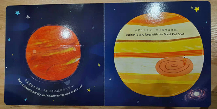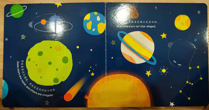 本书从孩子的视角出发,深入浅出地介绍了太阳、月亮、流星、八大行星等多种孩子愿意探知的神秘星星。画风灵动可爱,语言富有童趣,中英文对照简明生动,而且内含20多个翻页和30多个洞洞,让孩子在不断翻翻页、抠洞洞的过程中,锻炼手眼协调性,激发阅读兴趣,培养想象力和逻辑思维能力,获得捉迷藏般的阅读体验,更好地认知大千世界。