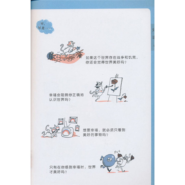 “儿童哲学智慧书”的另一大特色就是将严肃而深刻的思考消解在趣味十足的图画里。虽然是哲学启蒙书,但考虑到小读者的心理和兴趣特点,本套丛书特别采用了全彩绘本的形式,简约睿智的问题配以童趣十足的字体、诙谐风趣的图画,可谓意蕴深远,奇趣盎然。