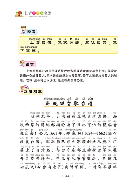 注音版《孙子兵法》虽然是一部兵学著作,但在书中丝毫看不到穷兵黩武的倾向,对于战争,孙子的基本观点是重战、慎战。在这样的战争观指导下,孙子发展了他的军事思想。它从战略理论的高度论述了战争谋略,其内容博大精深,思想精邃富赡,逻辑缜密严谨,奠定了我国古代军事理论的基础,并且在世界军事学术史上也占有极其重要的地位。