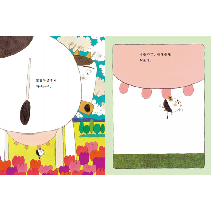 妈妈的脑袋是豆豆牛的瞭望台,豆豆牛每天都要站在上面决定去哪玩儿。妈妈的尾巴是豆豆牛的游乐场,等豆豆牛抓好了,妈妈就一圈一圈地转起来。妈妈的鼻子是电风扇,要是豆豆牛想去天上散步,妈妈就会帮他一下。妈妈的的耳朵是豆豆牛温暖的床,晚上豆豆牛把一天发生的事情说给妈妈听……