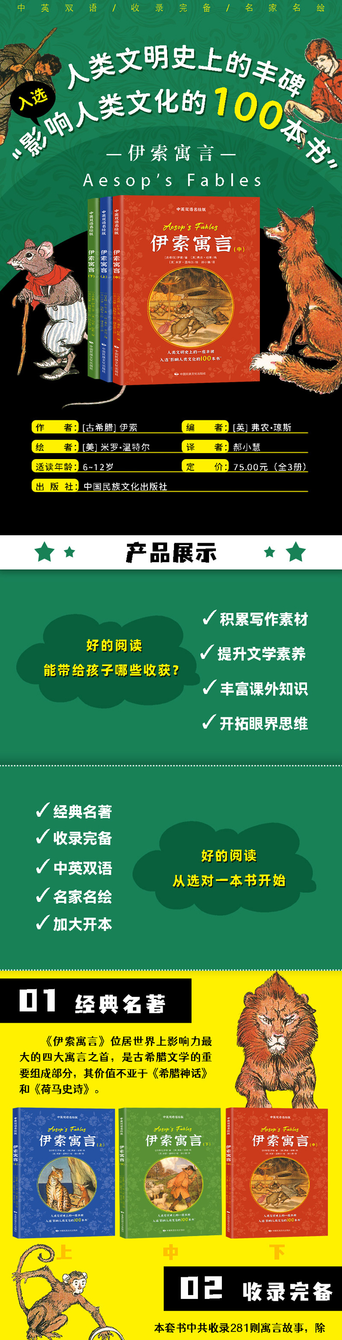 《伊索寓言》是世界上最早的寓言童话集之一,是古希腊文学的重要组成部分,本次推出的《伊索寓言》是中英双语彩图名绘版本,英文部分由英国著名文学家、翻译家弗农.琼斯编写,此版插图部分为美国米罗.温特尔的手绘插图,水平受到各国读者的广泛认可。 本版《伊索寓言》分上、中、下3册,包含了《狐狸和葡萄》《下金蛋的鹅》《猫和老鼠》《狐狸和乌鸦》《乌鸦喝水》《北风和太阳》《狼和小羊》《农夫和他的孩子们》《龟兔赛跑》《城里老鼠和乡下老鼠》《夜莺和老鹰》等281则经典的伊索寓言故事,囊括了《伊索寓言》广泛流传的绝大多数作品。作品通过简朴的语言体现了日常生活中那些不为我们察觉的真理。