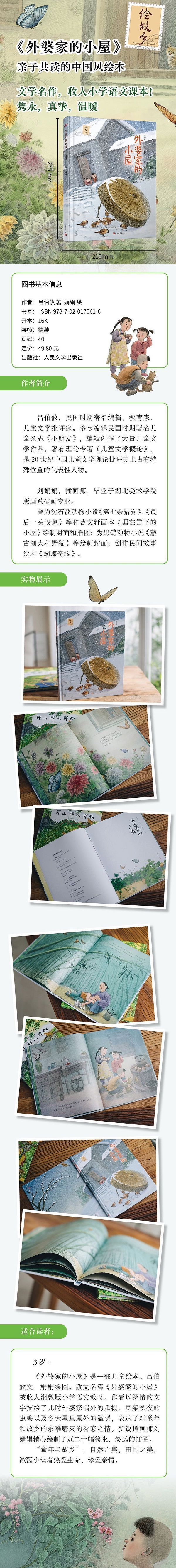 l 看见童年的美好,亲情的幸福,真挚,温暖 l 收入湘教版语文课本 l 中国风绘本,风格隽永、意境悠长 《外婆家的小屋》是一部儿童绘本。吕伯攸文,娟娟绘图。散文名篇《外婆家的小屋》被收入湘教版小学语文教材。作者以深情的文字描绘了儿时外婆家墙外的瓜棚、豆架秋夜的虫鸣以及冬天屋里屋外的温暖,表达了对童年和故乡的永难磨灭的眷恋之情。新锐插画师刘娟娟精心绘制了近二十幅隽永、悠远的插图。 “童年与故乡”,自然之美,田园之美,激荡小读者热爱生命,珍爱亲情。