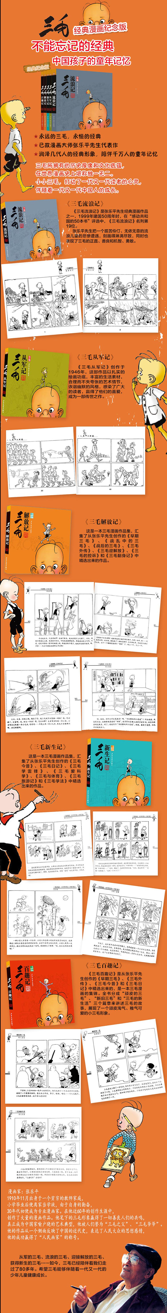 自1935年张乐平先生笔下第1幅三毛漫画问世以来,三毛形象深入人心,影响力波及海外。三毛漫画(经典版)共五册书:《三毛流浪记》《三毛从军记》《三毛解放记》《三毛新生记》和《三毛百趣记》,采用套装的形式,所选内容都是三毛漫画中的经典,其中三本书配有简洁、生动的文字说明,可以使读者更好地了解漫画的内容。本书为经典版,是三毛漫画的“礼品装”,主要针对三毛漫画的爱好者及收藏者。