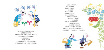 《金瓜儿 银豆儿》的插画为中国传统的剪纸风格。赵燕翼的故事风格干净利落、简单直接,所以柯明的剪纸插画,也就走了棱角分明,刚劲有力的路子,把一个充满阳刚之气的民间故事表现得淋漓尽致,让孩子们觉得有劲、过瘾。