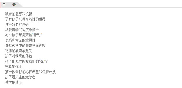这不是一本教育技巧指南,而是一段寻找教育情调的旅程。 亲爱的读者,在这本书中,你能通过一个个教育小故事,看到真正的教育者应有的样子——敏感而机智,知道什么对孩子合适、什么不合适,知道该说什么、不该说什么,关注孩子的独特之处,关注孩子的个体生活世界,懂得如何“看”孩子和“聆听”孩子。 只有真正的教育者,才能读懂孩子的内心,把准教育的基调,让教育和成长变得更加美好而充盈。