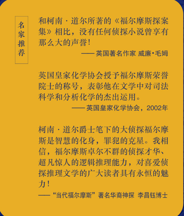《福尔摩斯探案集》是柯南·道尔侦探小说的集大成之作,也是世界文坛中脍炙人口的作品。其主人公福尔摩斯成为大侦探的代称、众人崇拜的英雄,一度令众多侦探小说的主人公黯然失色,同时他也是英国小说中刻画最生动的人物之一。