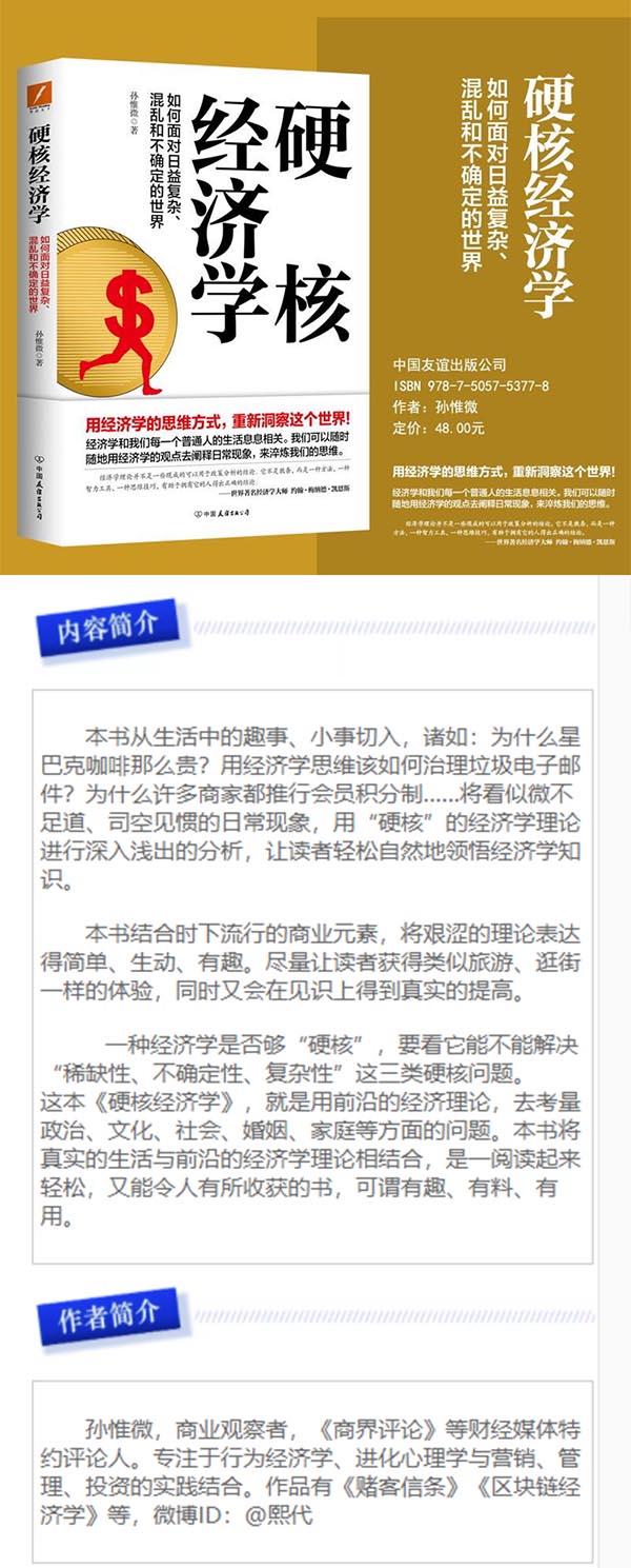 本书从生活中的趣事、小事切入,诸如:为什么星巴克咖啡那么贵?用经济学思维该如何治理垃圾电子邮件?为什么许多商家都推行会员积分制……将看似微不足道、司空见惯的日常现象,用“硬核”的经济学理论进行深入浅出的分析,让读者轻松自然地领悟经济学知识。 本书结合时下流行的商业元素,将艰涩的理论表达得简单、生动、有趣。尽量让读者获得类似旅游、逛街一样的体验,同时又会在见识上得到真实的提高。 一种经济学是否够“硬核”,要看它能不能解决“稀缺性、不确定性、复杂性”这三类硬核问题。 这本《硬核经济学》,就是用前沿的经济理论,去考量政治、文化、社会、婚姻、家庭等方面的问题。本书将真实的生活与前沿的经济学理论相结合,是一阅读起来轻松,又能令人有所收获的书,可谓有趣、有料、有用。
