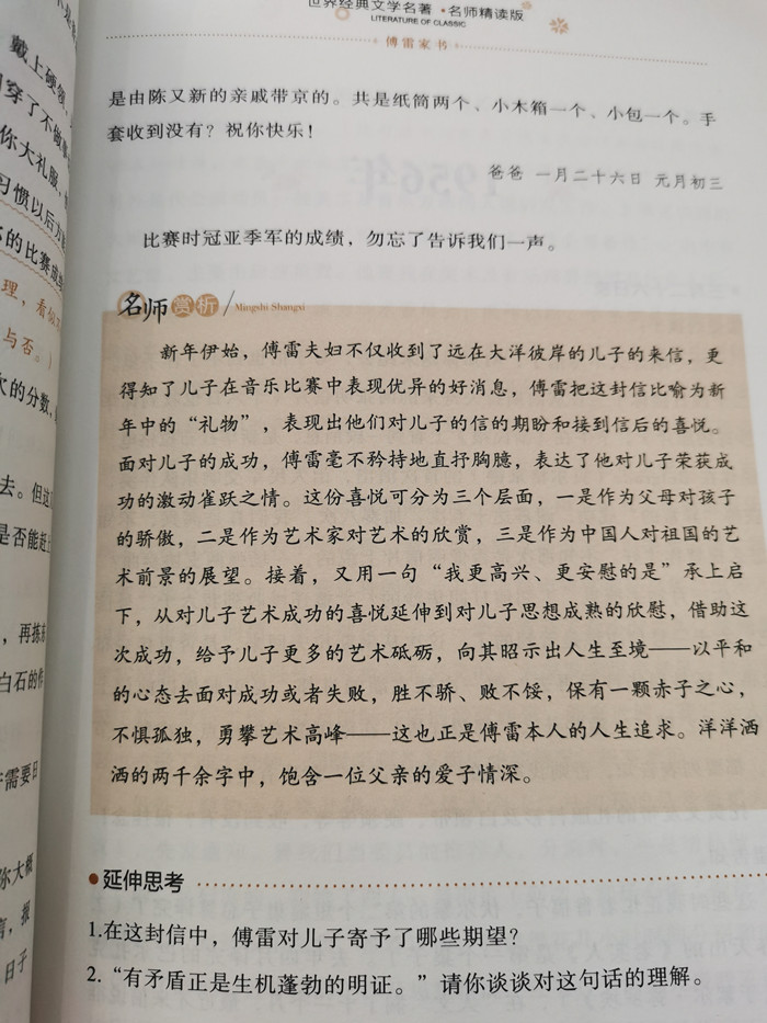 傅雷家人亲自编定的家书精选本,以厚重风格反映家书全貌,全面展示傅雷家风,再现傅氏兄弟成长的家教背景。基于家书完整著作权的占有,本书情节完整,背景清晰,人物鲜明,好看感人。贯穿全书的傅雷家人照片和家书墨迹与内容相辅相成,拉近了家书与读者的距离,完全迥别于其他内容不完整的选编本。书中珍贵照片、楼适夷初版代序、傅聪家信及英法文信为独家版权,2017年不随傅雷著作权进入公版,其他任何家书选本不能收录。