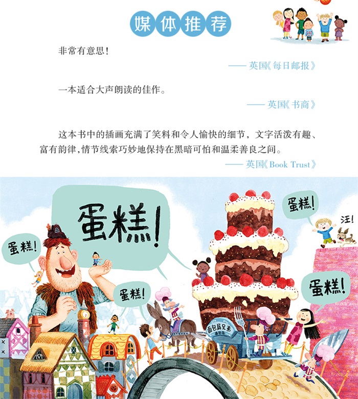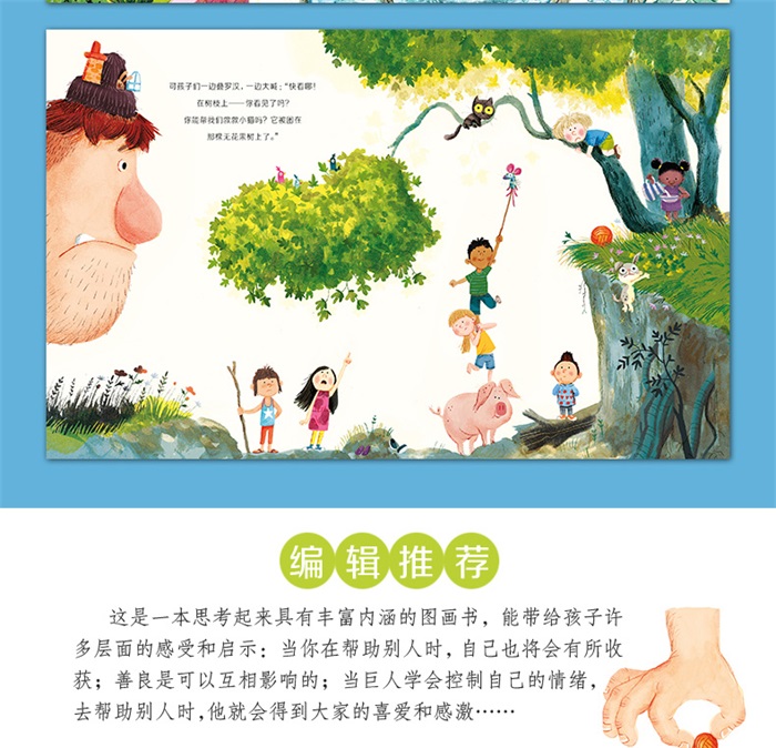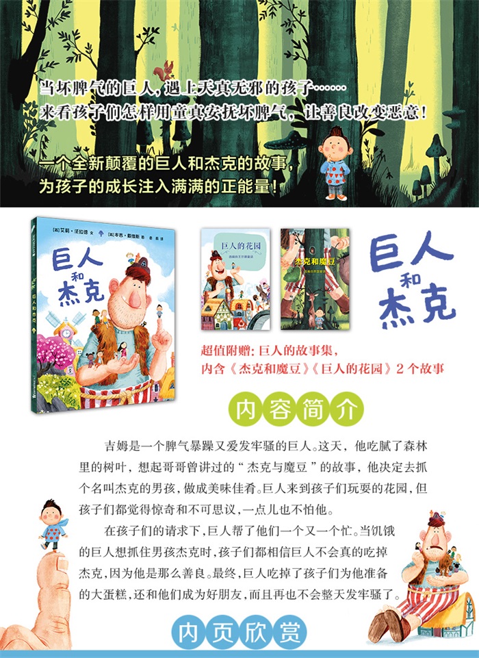 《巨人和杰克/麦克米伦世纪童书》是一个关于助人为乐和情绪管理的图画书。吉姆是一个脾气暴躁又爱发牢骚的巨人。他总是吃森林里的树叶,早就吃腻了。这天,他想起哥哥曾讲过的“杰克与魔豆”的故事,决定去抓一个名叫杰克的小男孩,做成美味佳肴。巨人来到孩子们玩耍的花园,但孩子们都觉得惊奇和不可思议,一点也不怕他。在孩子们的请求下,巨人帮了他们一个又一个忙。当饥饿的巨人想抓住男孩杰克时,孩子们都相信巨人不会真的吃掉杰克,因为他是那么善良。终,巨人吃掉了孩子们为他准备的大蛋糕,还和他们成为好朋友,而且再也不会整天发牢骚了。