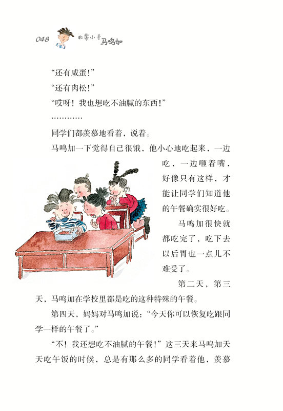 《非常小子马鸣加4:神秘的大侦探》记录了马鸣加从二年级到三年级的校园生活。在《特殊的午餐》里,马鸣加犯了胃肠炎,不能和同学们吃一样的午餐,同学的目光全被马鸣加特殊的午餐吸引住了,紧紧盯住马鸣加的饭盒。他故意慢慢地打开饭盒,大家羡慕地看着说着。马鸣加小心地吃起来,砸吧着嘴,好像只有这样,才能让同学们知道他的午餐真的很好吃。