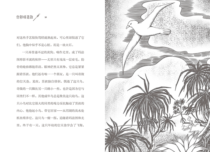 《你那样勇敢》,讲述了一个名叫玛法图的男孩,在十五岁那年,负气离开家乡希库埃鲁,驾着舷外支架独木舟,走出去面对他最为恐惧的东西——大海。玛法图生于海岛,自幼与海为伴。然而,在三岁那年,一场可怕的风暴,把他和母亲的独木舟卷入深海。母亲垂死之际,把他从海神莫阿那贪婪的手中抢了回来。自此之后,玛法图始终无法忘记母亲冰凉的脖颈,无法摆脱对大海的恐惧。