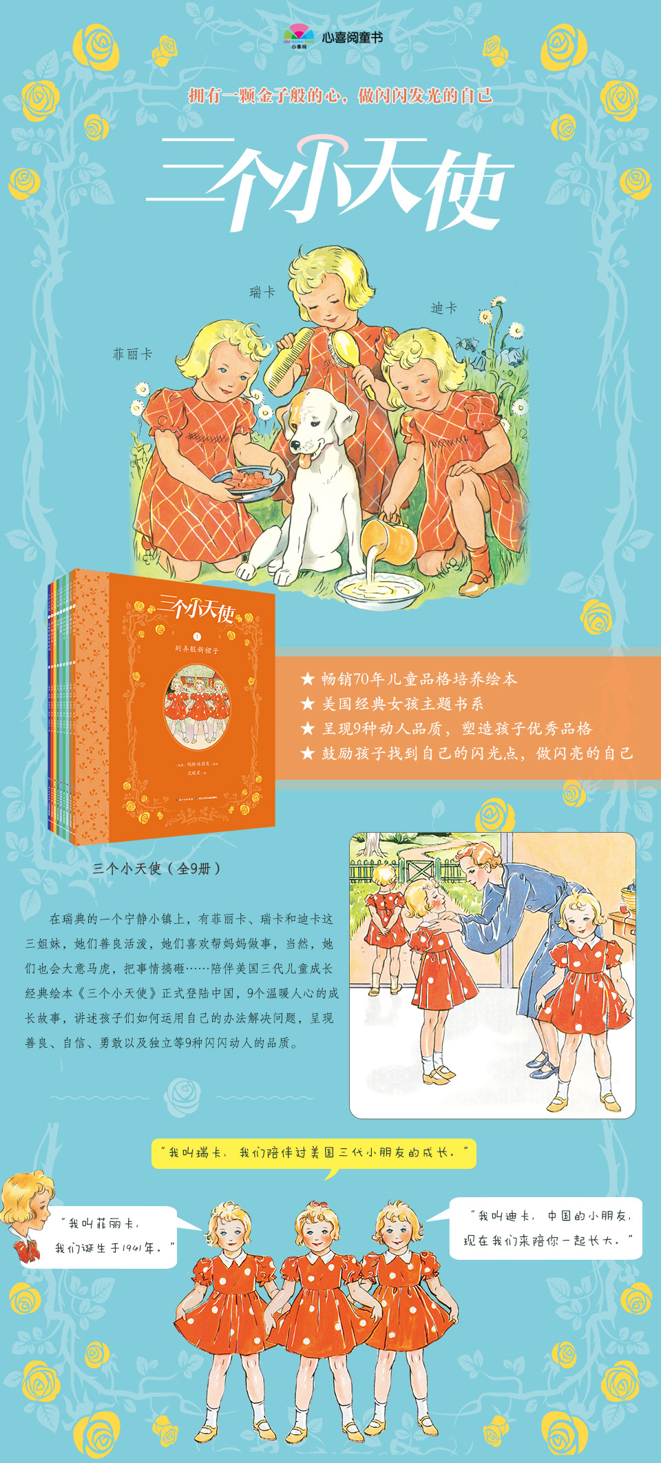 通过菲丽卡三姐妹的故事,作者向我们展示了三个善良、乐于助人、懂得关爱他人又独立坚强的孩子,倡导孩子们在阅读中收获永远不会在时代洪流中褪色的品格。全系列9册,分别向我们呈现了9种优秀的品格,这些品格即使经过时光的洗练,仍然熠熠生辉,是一个人身上最动人的特质。《三个小天使》是塑造孩子优秀品格的绝佳榜样,同时,书里向我们展示了优美的瑞典田园风光,传递人与人之间互助、信任、感恩的正能量,让孩子们在阅读中回归到纯真朴质的生活,充满对生活的热爱。
