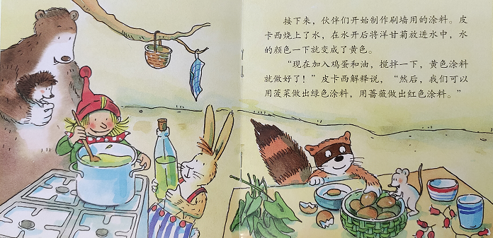 皮卡西邀请朋友们来家里吃可可蛋糕,Langbein开心地从门外飞奔而来,一个不小心把可可撞飞到了墙上,墙上脏了,皮卡西决定重新刷房子。皮卡西和小伙伴收集原材料来做颜料,去采集菠菜叶子做绿颜料,采洋甘菊的花朵做黄色颜料,采玫瑰花做红色颜料。小伙伴们做了三大桶颜料,它们管兔子要来了他复活节刷彩蛋的刷子、小浣熊用尾巴也开始粉刷起来。最后它们用黄色刷墙,绿色刷门,红色刷窗子,房子焕然一新了,大家都很开心!