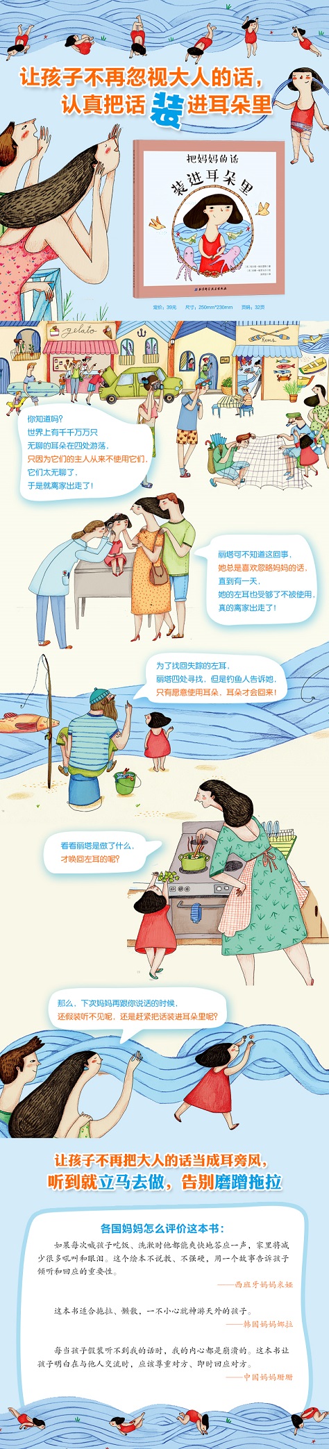 格丽塔经常听不到别人说的话,比如在海里游泳时,妈妈多次喊她上岸她都听不到。对此她归咎于海水灌进了耳朵。但其他情况呢,所有理由都不是这么充分的哦。终于有一天,她的左耳不见了!据说,这可怜的耳朵因为不怎么受重用,决定离家出走!只有一只耳朵当然很不方便,格丽塔决定找回自己的左耳。但这一切,需要从学会倾听开始!你会倾听吗?妈妈的话你听到几遍才会执行呢。