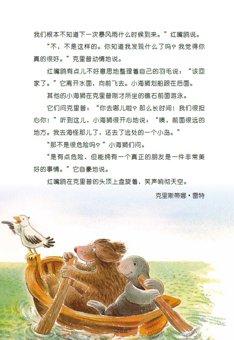 “太阳出来了,大海也风平浪静的。你为什么不去游泳或潜水给自己抓条鱼吃呢?” “我哭,是因为我没有朋友。”克里普回答说, “没有朋友,干什么都没意思。” 红嘴鸥单腿站立起来,陷入了沉思。