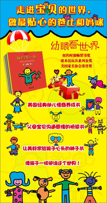 也正因“幼眼看世界”的独特画风及亲子共读特性,让这套美国著名图画书作家陶德•帕尔的代表作品,一度成为了最受美国孩子和家长欢迎作品之一。“幼眼看世界”全系列一共15册,包括《我们在一起》、《家庭》、《爸爸》、《妈妈》、《爷爷》、《奶奶》、《我爱你》、《没什么大不了》、《我不害怕了》、《跟着感觉走》、《感觉真棒》、《没关系》、《和平》、《地球》、《读书让你感觉很棒》。主题涵盖孩子的自我认知和接纳,对家人和朋友关系的认知和接纳,还有对世界的认知和探索,是深受美国孩子欢迎的情商素养养成书。