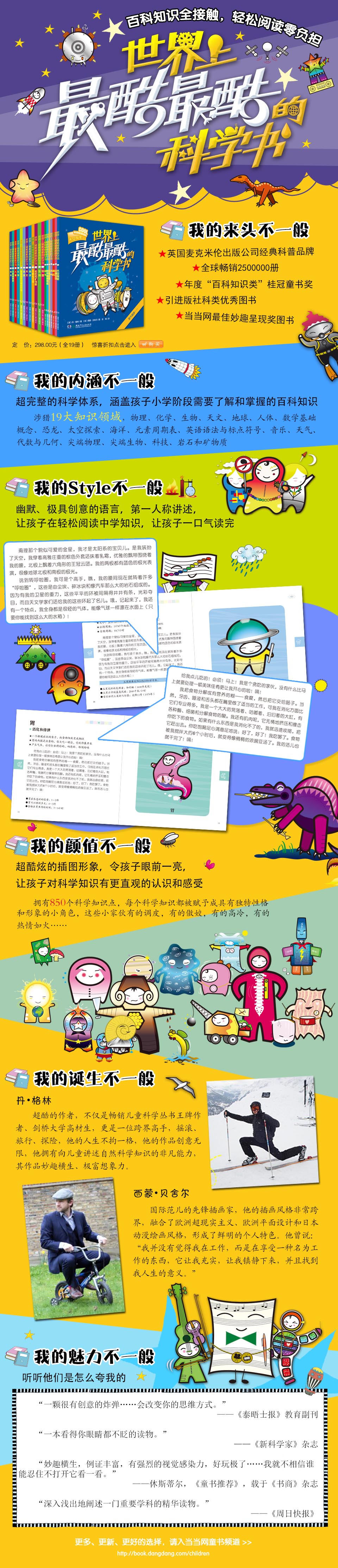 这是一套自英国麦克米伦出版公司引进出版的儿童百科图书,包括物理、人体、地球、化学、海洋、科技、天气、恐龙、音乐、数学、尖端物理等19本。文中以第 一人称的口吻,用幽默的语言向孩子们讲述各种知识,同时,每一个知识点都配有拟人化的酷酷形象,让孩子们在快乐阅读中轻松地学习科学知识。