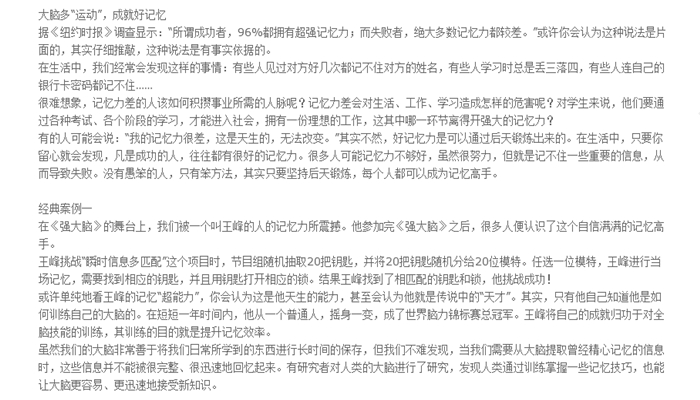 《记忆脑科学》从认识自己的大脑和记忆力开始,帮助读者在短的时间内挖掘大脑的潜能。 《记忆脑科学》共有七章,分别从修炼大脑、改善记忆、补充营养、用脑模式、科学记忆方法、训练诀窍、记忆巩固等方面,介绍记忆力开发和训练的知识,让读者学会用科学的方法提升记忆力,成为令人羡慕的记忆达人。